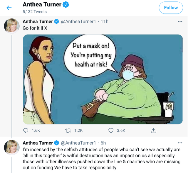 شاركت أنثيا ترنر مقدمة العرض السابقBlue Peter ، 60 عامًا، رسماً كاريكاتورياً لامرأة سمينة على كرسي متحرك تحذر أنثى بلا قناع: “أنتِ تعرضين صحتي للخطر” واتُهمت أنثيا تيرنر بالتشهير بالسمنة والهجوم على المعوقين وكان حملة ضدها على مواقع التواصل.